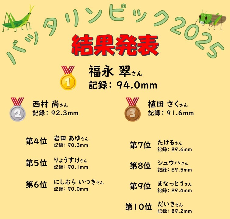 お待たせしました! 今年も開催したバッタの大きさくらべ 『バッタリンピック2025』について 9月末で締め切った結果を公表いたします。 ![]() トップ10にランクインされた皆さん、 おめでとうございます! 第10位までの方に、 ふれあいの森オリジナルグッズをご用意しております。 ※計測時にお渡しした記録カードをご持参ください。 10月 11日(土)から11月30日(日)の期間に、 森の館カウンターへお越しください。 ご不明な点がありましたら、お問合せ(072-290-0800)を お待ちしております。 |